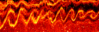 The energy cascade in ocean mixing remains poorly understood due to the wide separation of scales at very high Reynolds numbers Re. We present a new conceptual model for this cascade, based on high-resolution multibeam echo-sounding observations from the mouth of the Connecticut River (USA), a shallow salt-wedge estuary featuring striking Kelvin-Helmholtz billows on a vertical scale of ~1-2 m (see image). The multibeam captures instantaneous two-dimensional images that reveal the structure and evolution of turbulent mixing using acoustic backscatter as a proxy for salinity microstructure dissipation, i.e. mixing. At Re ~ 106, we find that mixing is dominated not by the slowly evolving billow cores, which rarely overturn, but by fast, sustained turbulence within the braids that connect them, energised by baroclinic shear within their slopes. Secondary shear instabilities within the braids are predicted by two-dimensional direct numerical simulation with parameters matching the field values. Braid dissipation and mixing is quantified by scaling arguments derived from laboratory experiments in an inclined channel, and may explain why the primary billows do not overturn. This braid-dominated mixing contrasts with the core-dominated mixing seen in transient numerical simulations at Re ~ 103-104, indicating that high-Re mixing hotspots continuously driven by large-scale shear – in estuaries, wind-driven surface currents, and deep overflows – may operate through fundamentally different cascade dynamics than previously thought.